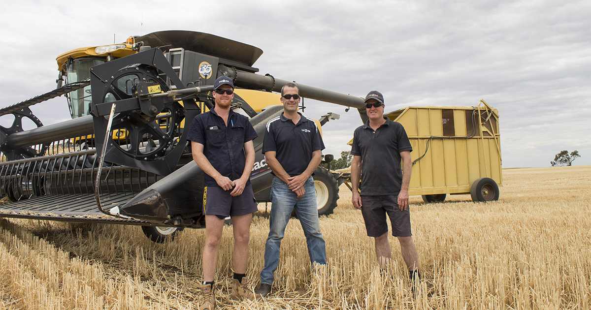 L-R: Tim Edwards, Chris Davey (YP-AG) and Peter Edwards. Chaff carts have served a purpose but their time on the Edwards’ farm is limited and this harvest they will most likely introduce a chaff deck system to replace the chaff cart.