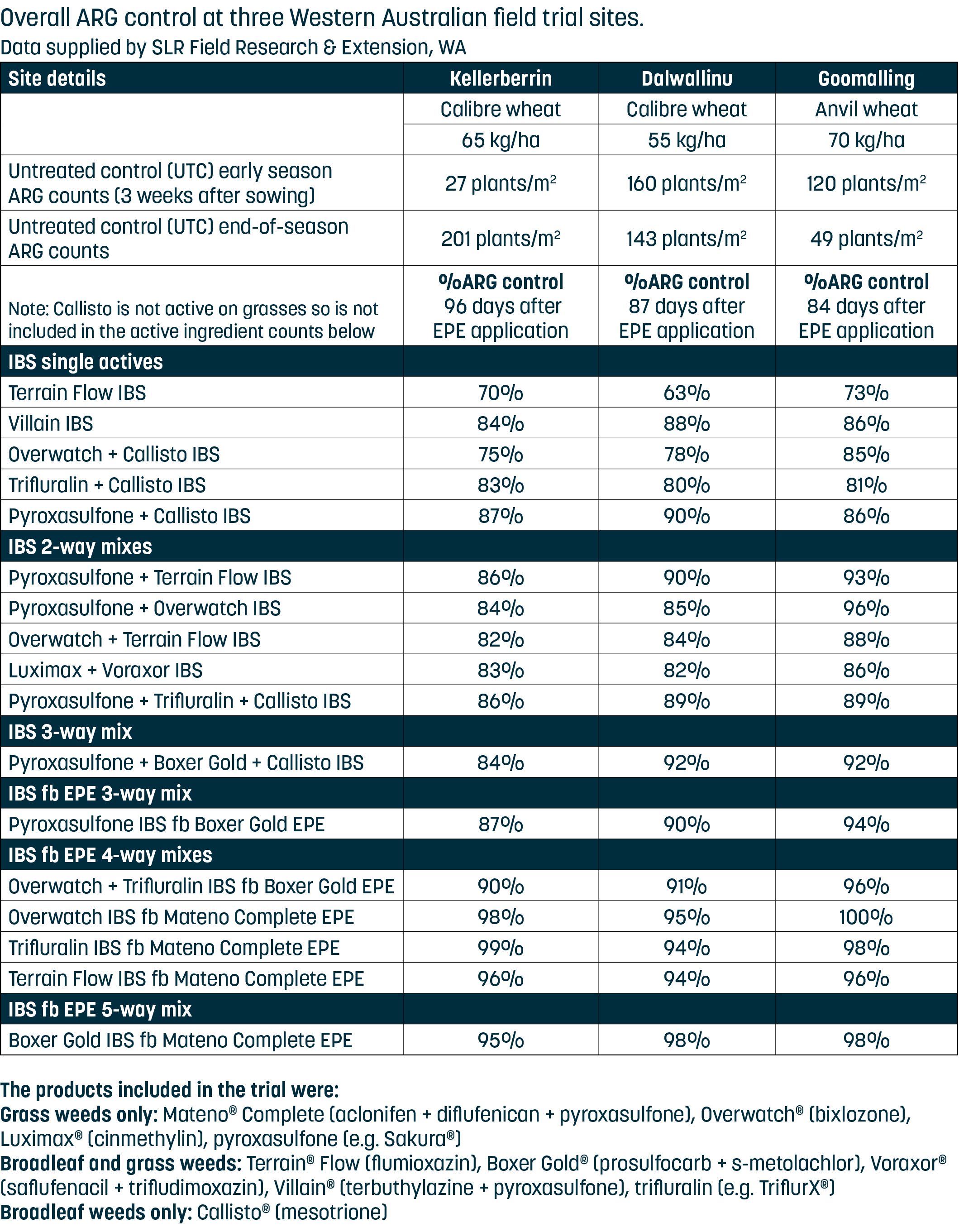 Fifteen days after the EPE treatments were applied, all treatments were assessed for ARG density. The UTC had 146 ARG/m2, and all herbicide treatments had 45 ARG/m2 or less (at least 70% control). Trifluralin IBS fb Mateno Complete EPE (98% control) and Boxer Gold IBS fb Mateno Complete EPE (97% control) were the best performers, followed by Terrain Flow IBS fb Mateno Complete EPE (96% control). Next were Overwatch + Trifluralin IBS fb Boxer Gold EPE and Overwatch IBS fb Mateno Complete EPE at 93 and 92 per cent control, respectively. Visual crop phytotoxicity effects were observed in most EPE treatments and a few IBS-only treatments at this crop stage.