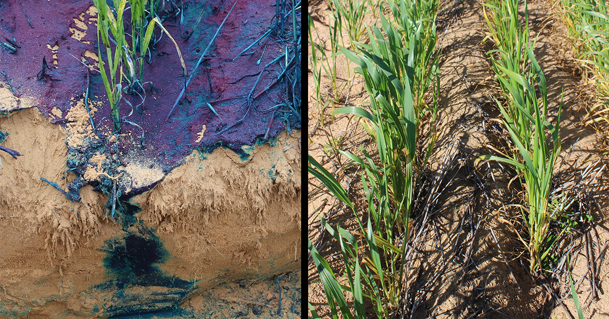 Blue dye shows the higher moisture that can be found beneath last year’s row (left) and crop sown using edge row placement into last year’s crop stubble. Photos: Bill Davoren CSIRO