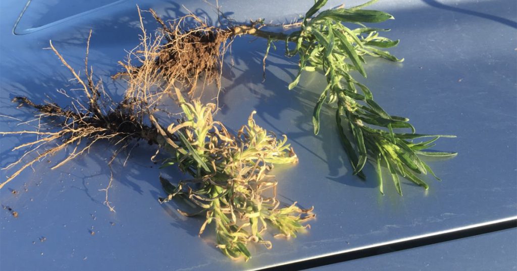 The fleabane on the right was unresponsive to glyphosate on its own but mixing picloram with triclopyr or 2,4 D to the glyphosate application was effective (left).