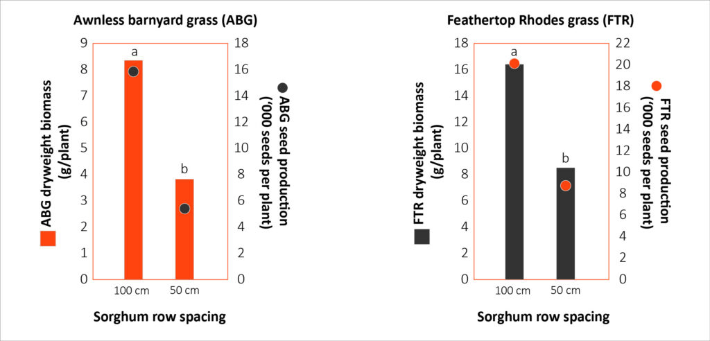 The take home message from four years of research at Narrabri, NSW and Hermitage, Qld, is that halving sorghum row spacing can halve weed seed production in both feathertop Rhodes grass and awnless barnyard grass.