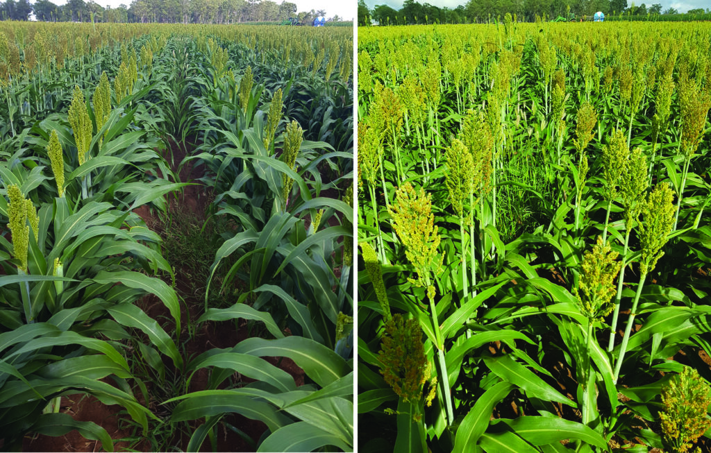 Left: weeds growing uninhibited in the inter-row space of sorghum sown at 1 m row spacing. Right: Fewer weeds can establish when the canopy closes in sorghum sown at 50 cm row spacing.