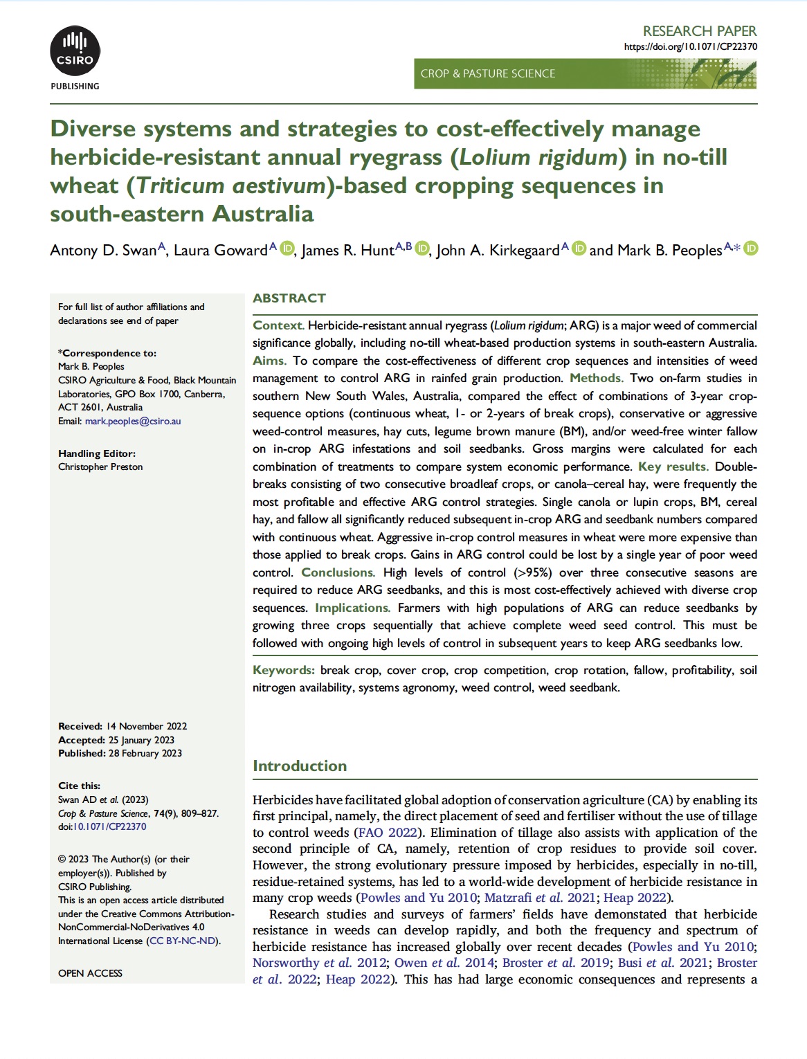 Context: Herbicide-resistant annual ryegrass (Lolium rigidum; ARG) is a major weed of commercial significance globally, including no-till wheat-based production systems in south-eastern Australia.