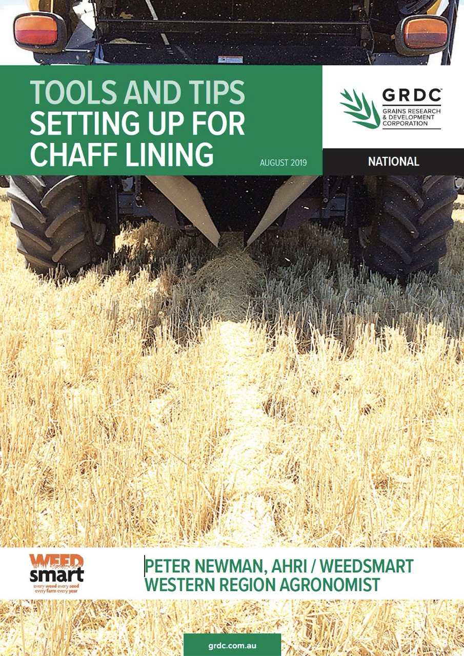 Chaff lining involves making a simple chute (see page 12 of the PDF) to divert the weed seed-bearing chaff fraction (from the sieves) into a narrow windrow, which is left to rot or mulch while the straw is chopped and spread.