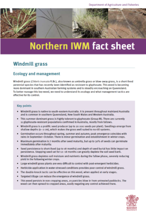Windmill grass (Chloris truncata R.Br.), also known as umbrella grass or blow-away grass, is a short-lived perennial species that has recently been identified as resistant to glyphosate. This weed is becoming more dominant in southern Australian farming systems and is steadily encroaching on Queensland. To better manage this key weed, we need to understand its ecology and what management tactics are effective for its control.